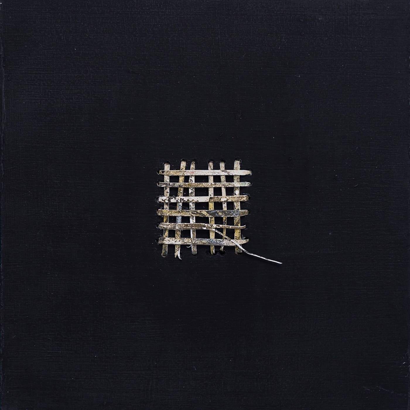Ein beinahe lichtloses Schwarz öffnet sich wie ein endloser Raum. Im Inneren erscheint ein zartes Papierquadrat, ein Geflecht aus fein geschnittenen Fäden. Es wirkt fragil und still, zugleich verdichtet und standhaft – ein leiser Kern im Dunkel.