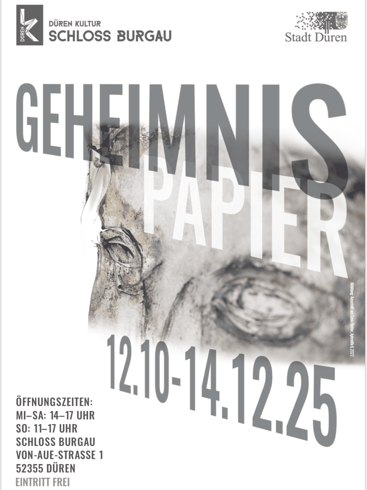 Heute erhielt ich eine E-Mail von Herrn Hallmanns: Das Plakat für meine nächste Ausstellung ist nun in Druck gegeben. Ich freue mich sehr, dass er eines meiner Motive für die Bewerbung der Ausstellung „Geheimnis Papier“ auf Schloss Burgau ausgewählt hat. Es ist ein besonderes Gefühl, die eigene Arbeit nicht nur in den Räumen der Ausstellung, sondern auch bereits im öffentlichen Bild der Einladung und Werbung vertreten zu sehen.